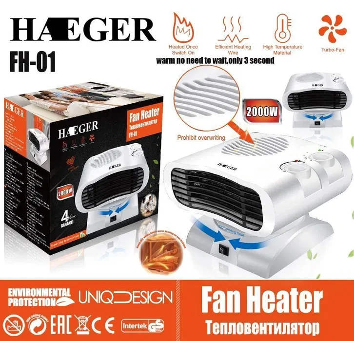 Тепловентилятор в компактном корпусе из термостойкого пластика работает в трех режимах. Подача горячего, теплого или холодного воздуха (режим вентиляции). Устройство рассчитано на работу в помещении с максимальной площадью 20 кв.метра.